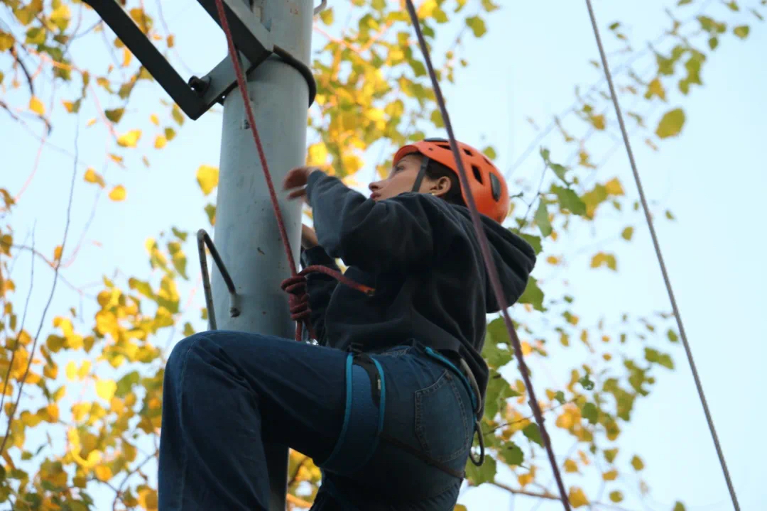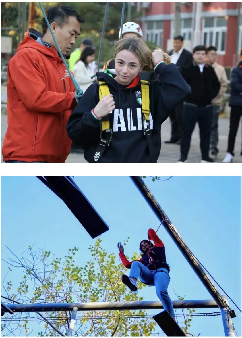 在体育休闲与旅游学院教师指导下,营员挑战了高空滑索、攀岩等素质拓展训练。