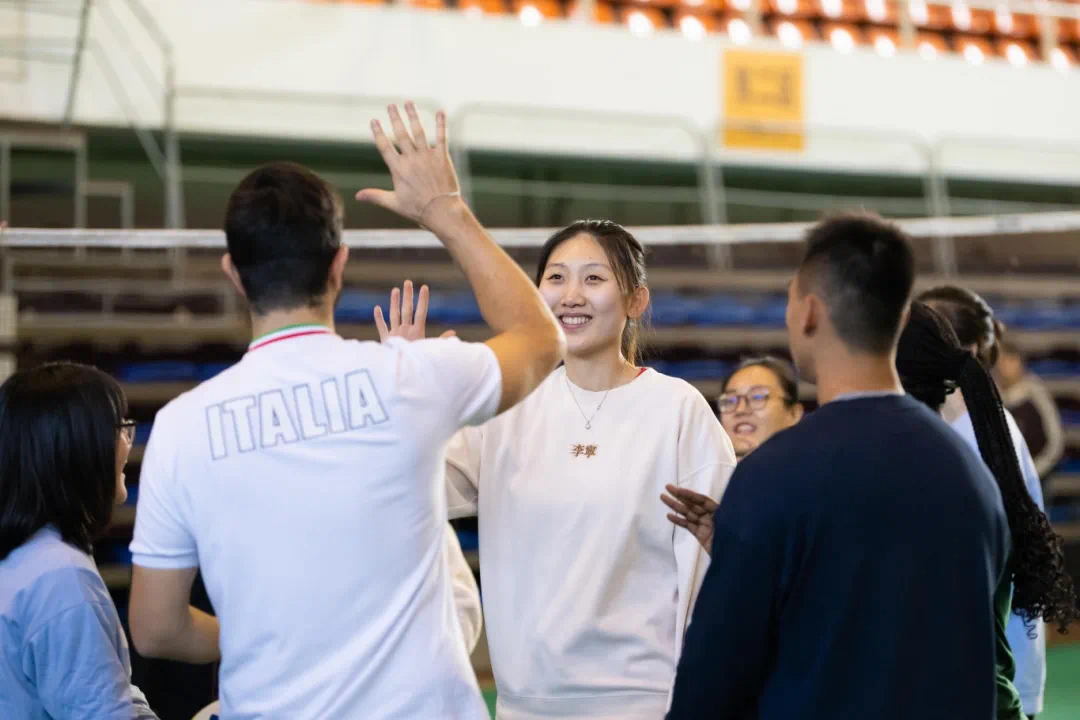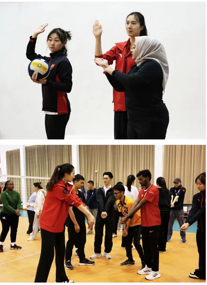 中国排球运动学院师生带领营员们学习软式排球的基础知识,分组开展排球比赛。