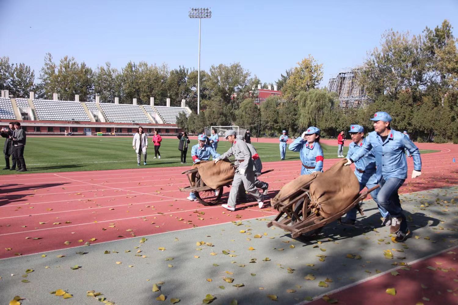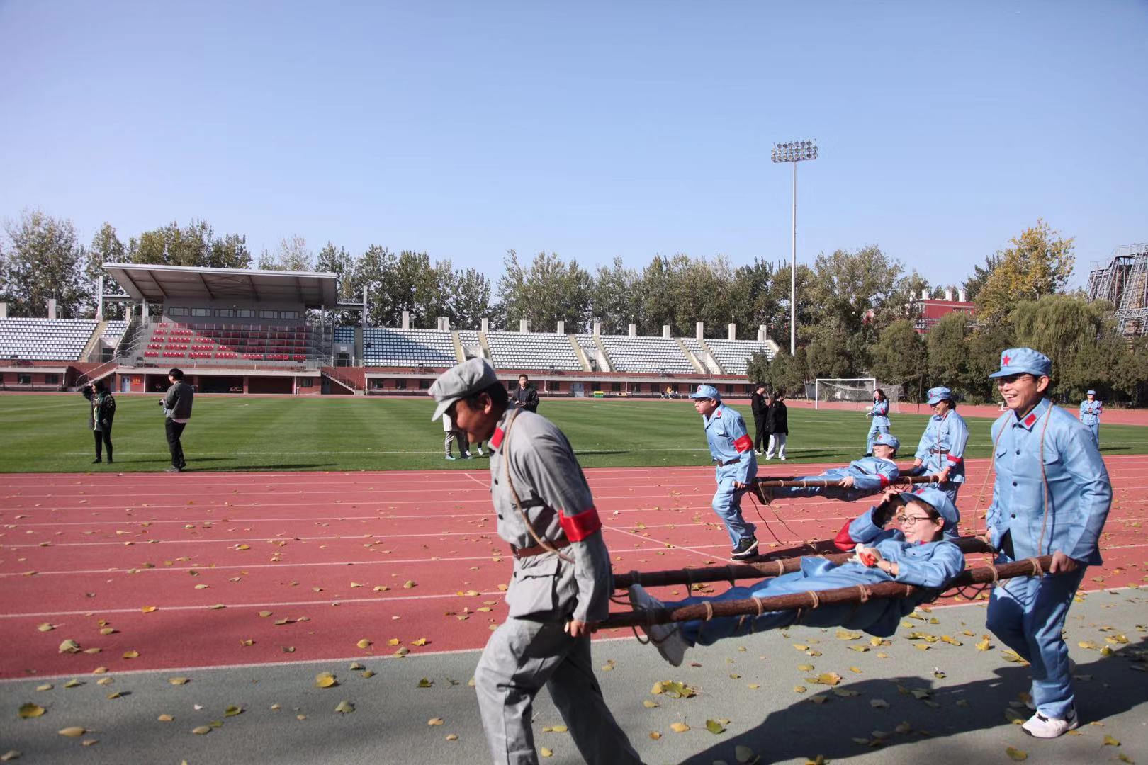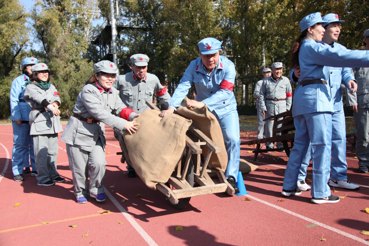陈毅元帅曾说过“淮海战役的胜利是人民群众用小推车推出来的”。党员同志们身着红军服,摩拳擦掌准备比赛。运动会分为两个部分,第一部分为模仿红军推独轮车运输战备物质,第二部分为模仿红军抬担架抢救伤员。大家三人一组奋力拼搏,重现了军民鱼水情的战争场景,革命传统贯穿每一位党员同志身心。