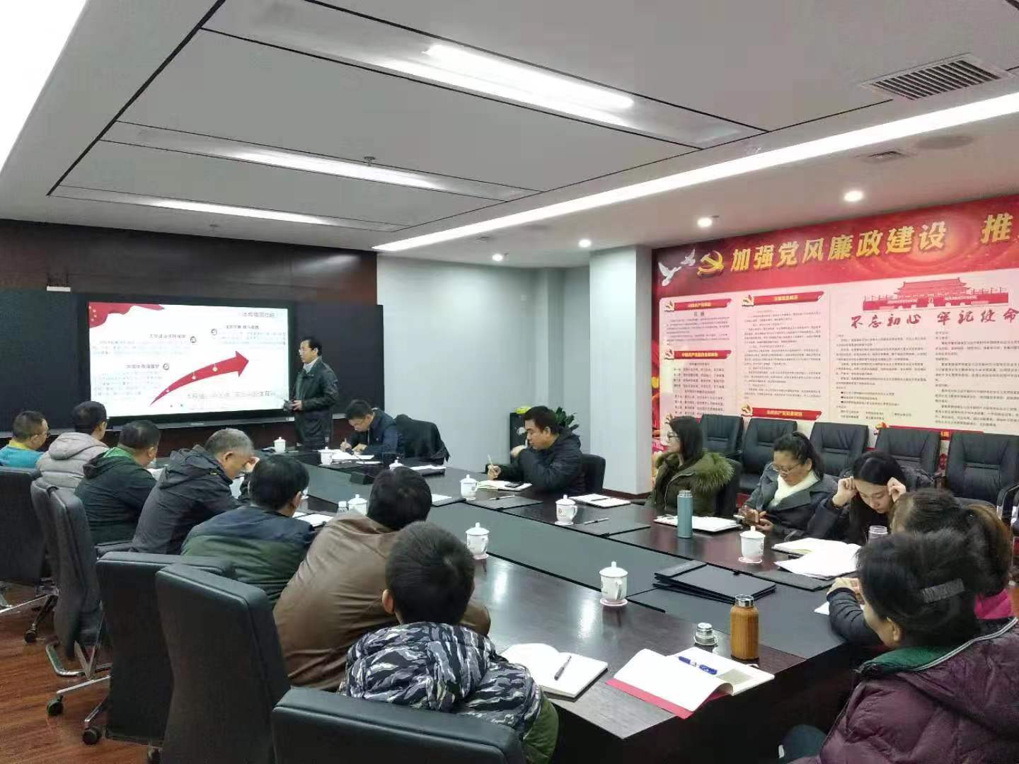 紧接着,张强强总经理带领全体与会人员,认真学习了党的十九届四中全会精神——《中共中央关于坚持和完善中国特色社会主义制度推进国家治理体系和治理能力现代化若干重大问题的决定》。
