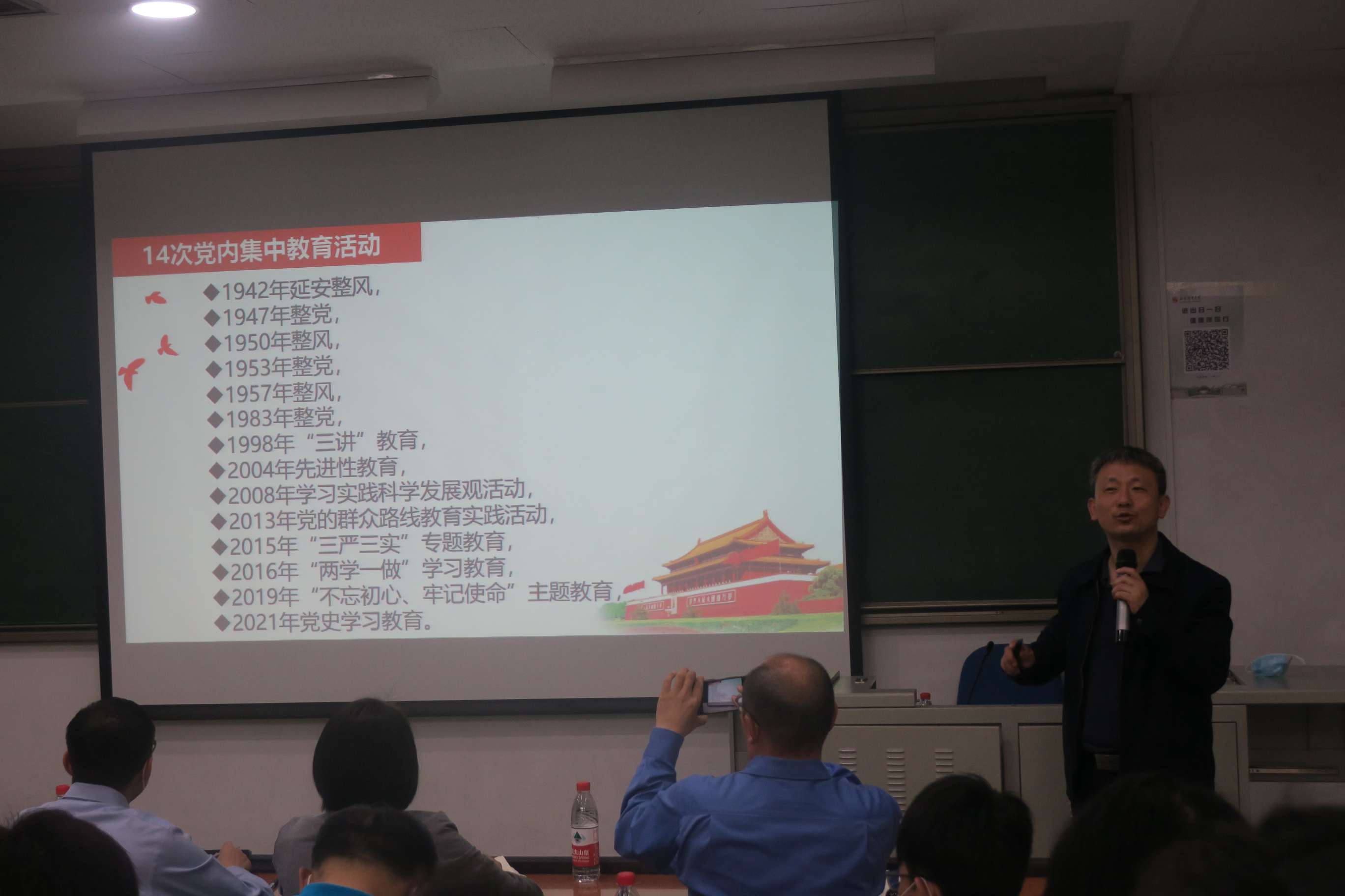 田志宏书记用深入浅出的语言、生动详实的案例,从主要起因、主要内容、主要任务、深远影响等多角度向参会师生介绍了从1942年延安整风运动到2021年党史学习教育,共计14次党内集中教育活动。结合我国现阶段的发展任务和社会需要,田书记对党内集中教育的现实启示进行总结。他强调,开展党的集中教育是提高党的战斗力、推动党的事业更好发展的必然要求。全体师生在党史学习教育中一定要着眼于思想理论武装,坚定理想信念信仰。对马克思主义的信仰,对社会主义和共产主义的信念,是共产党人的政治灵魂,是共产党人经受住任何考验的精神支柱,决定我们的方向和立场,也决定我们的言论和行动。党史学习要着眼于指导实践,推动工作,提高党员素质和干部能力。田书记要求广大师生党员必须要与时俱进,紧跟形势,不断加强学习,更新知识,提升素质。14次党内集中教育活动历程反映了我们党勇于变革、勇于创新、永不僵化、永不停滞的治党治国之道,揭示了我们党始终保持马克思主义政党本色、永不脱离群众和具有蓬勃活力的根本奥秘之所在。田书记指出,通过党史学习教育,提升党员的党性,更好地增强“四个意识”、坚定“四个自信”、做到“两个维护”,通过学党史、悟原理、办实事、开新局,更好更快地推动中华民族伟大复兴建设事业。