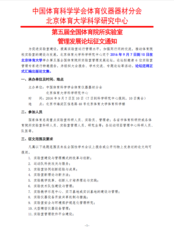 【科研中心】第五届全国体育院所实验室管理发展论坛征文通知