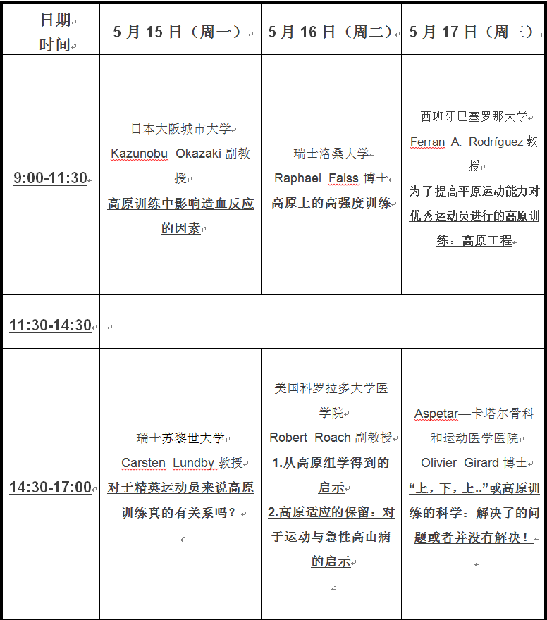 在简短的开幕式后,日本大阪城市大学Kazunobu Okazaki副教授为大家做了题为Confounding factors for the erythropoietic response to altitude training(高原训练中影响造血反应的因素)的讲座。 国籍 海外任职单位 学位 职务/职称 Ferran Rodriguez 西班牙 西班牙巴塞罗那大学 博士 教授 美国 Aspetar—卡塔尔骨科和运动医学医院 博士 研究员 Carsten Lundby 丹麦 瑞士苏黎世大学 博士 教授 Raphael Faiss 瑞士 瑞士洛桑大学 博士 副教授 Robert Roach 美国 美国科罗拉多大学丹佛分校 博士 副教授 Kazunobu Okazaki 日本 日本大阪城市大学 博士 副教授 1、Ferran Rodriguez 弗伦•罗德里格兹博士是西班牙巴塞罗那大学国立体育研究院教授。1989年获得西班牙巴塞罗那大学医学和运动生理学博士学位。自1983年起罗德里格兹博士分别于不同时期担任了西班牙赛艇、游泳、水球、田径、棒球和自行车等多支国家队的队医和运动生理学家,具有丰富的运动队实践经验。多年来,罗德里格兹博士致力于高原训练基础理论以及应用效果方面的研究和国际合作工作,于2009年开始,组织多国科学家共同进行游泳项目高原训练效果与最佳实践模式的研究,取得了丰硕的成果。罗德里格兹博士曾经发表过各类学术论文超过100篇,其中三十多篇被SCI期刊收录,是高原训练领域的杰出科学家。 奥利弗·吉拉德博士现在就职于卡塔尔骨科和运动医学医院(ASPETAR –Qatar Orthopaedic and Sports Medicine Hospital)运动员健康与运动能力研究中心、瑞士洛桑大学生物与医学学院生理系运动科学研究所,服务与众多世界顶级运动员。吉拉德博士的主要研究方向为环境因素对于神经肌肉疲劳发展的影响以及高原训练对于集体项目运动员的影响。这些研究都围绕着在高压力的环境中例如高温,高原环境中进行高强度间歇训练对于神经肌肉、代谢以及心血管的影响展开。吉拉德博士已经发表了超过83篇SCI论文。 3、Carsten Lundby Lundby博士现任职于瑞士苏黎世大学生理学研究所,他的研究主要涉及人体对于低氧环境的生理反应与适应过程。他领导的团队关注低氧与线粒体能量代谢的关系、氧气的运输与利用、低氧对于最大运动能力的限制因素、EPO的作用等。他们的团队已经发表了一百多篇关于低氧生理相关的论文。 4、Raphael Faiss Raphael Faiss博士现就职于瑞士洛桑大学反兴奋剂科学研究中心科学研究部主任。Faiss博士的研究集中在低氧训练对于优秀运动能力的影响。完成博士学位后,Faiss博士为瑞士国家自行车队全职工作了两年,负责全面的科研支撑工作。Faiss博士曾是世界级的优秀自行车运动员,取得了多次自行车世界锦标赛的冠军,他的优秀运动员经历与科研经历使他在优秀运动能力的提高研究领域卓有建树。 5、Robert Roach Robert Roach博士现任美国科罗拉多大学丹佛分校医学院副教授,低氧研究中心主任。Roach博士的研究主要关于人体对于高原低氧的反应,从系统生物学的角度阐释低氧对于人体产生的影响,包括基因组的变化、表达谱的变化以及蛋白组学的变化,从而预测人体对于低氧的反应,理解低氧下的人体变化。Roach博士已经发表了超过70篇SCI论文。 6、KazunobuOkazaki Kazunobu Okazaki博士现任日本大阪城市大学环境与运动生理系城市健康与体育研究中心副教授,医学院研究生院副教授。Okazaki博士的研究着眼于特殊环境如低氧、高热等对于人体心脑血管调节功能、心肺功能的影响。是日本年轻一代优秀的低氧研究学者。 附2:论坛日程