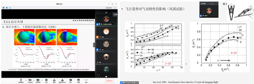 吴海军老师在沙龙中为大家介绍了什么是流体力学。流体力学是一个历史很悠久的学科,应用于航空、航天、流体机械等许多行业,在体育行业也有其应用场景。为让大家更加深刻理解流体力学,吴海军老师为大家讲解了流体力学中的常见现象,如湍流、旋涡、涡旋等。实验研究(风洞、水洞等)、数值计算(有限体积、有限元、fluent、CFX等)、理论分析是在流体力学研究中常用的研究方法。并为大家展示了流体力学中常见的研究装置,例如风洞装置、水槽装置等。最后吴海军老师以高尔夫球运动中,高尔夫球经受的流体力学分析,以及跳台滑雪过程中的流体力学的分析实例,为师生讲解了体育运动中的应用场景。