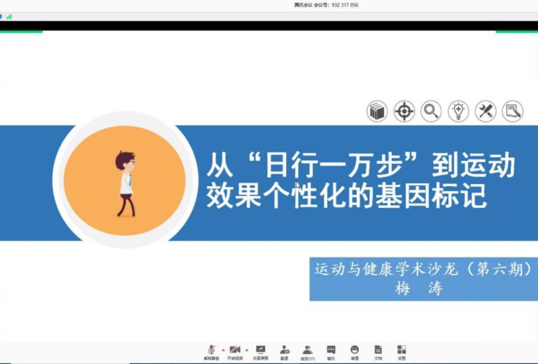 2020年5月7日上午,中国运动与健康研究院每周一期学术活动暨“运动与健康学术沙龙”第六期依托腾讯会议平台举行。本期学术沙龙由梅涛老师担任主讲人,以《从“日行一万步”到运动效果个性化的基因标记》为题进行了分享,学术沙龙由业务党支部书记张一民教授主持,研究院师生参与此次沙龙活动。