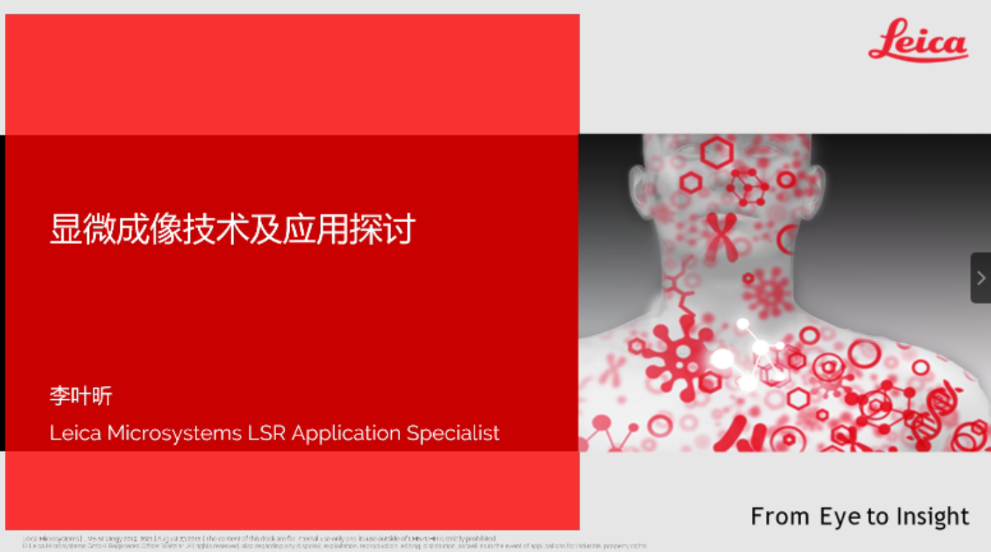 李叶昕工程师负责宽场、共聚焦及超分辨等光镜产品线的技术支持,毕业于上海交通大学生物医学工程系,研究方向为小胶质细胞免疫炎症机制。有数年微生物学、细胞生物学科研工作经历。2013年进入显微镜行业,在宽场及共聚焦系统成像应用领域积累了丰富经验。本次讲座主要从共聚焦显微镜原理;共聚焦显微镜可以帮助我们做什么;新一代STELLARIS引领共聚焦进入Tau时代;以及革新宽场:高分辨快速成像系统THUNDER四个大方面进行了讲解和介绍。