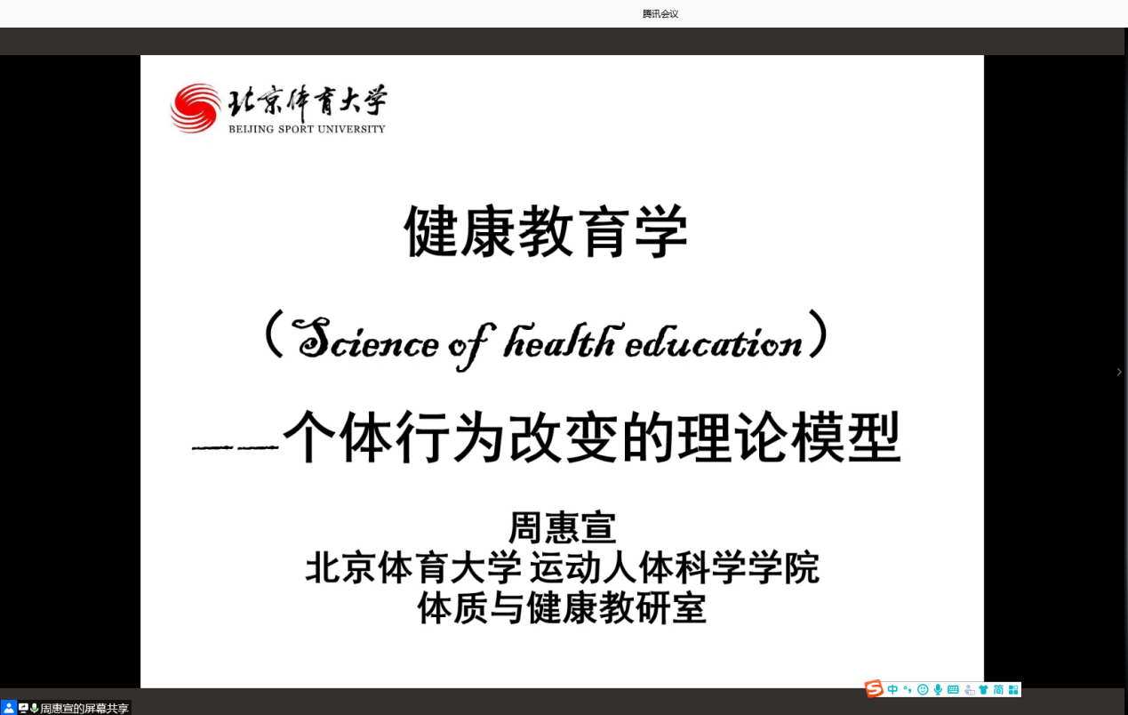 10月30日上午,中国运动与健康研究院每周一期学术活动暨运动与健康学术沙龙(第二十五期)如期在线举行。本期学术沙龙活动由业务党支部承办,由研究院刘卉教授主持,邀请到运动人体学院周惠宣博士进行了“健康教育学——个体行为改变的理论模型”的分享。