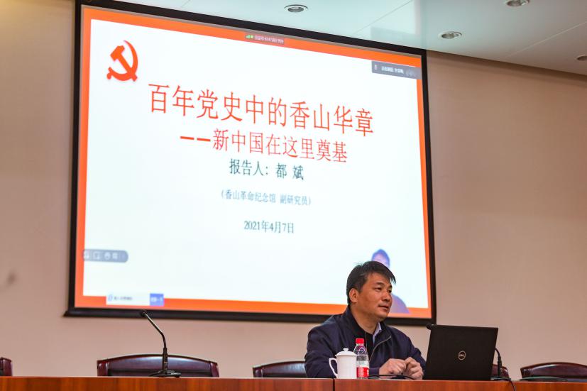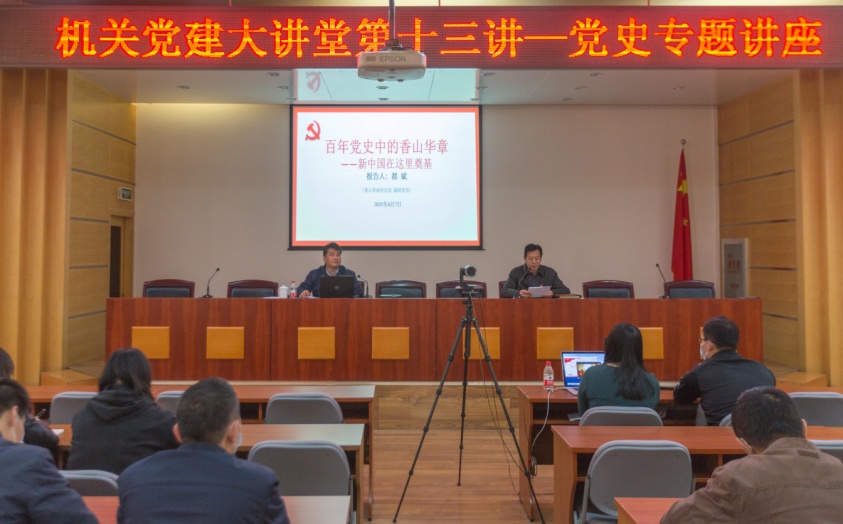 为推动机关党史学习教育走深走实,4月7日上午,机关党委组织开展“机关党建大讲堂第十三讲—党史专题讲座”,邀请到香山革命纪念馆的副研究馆员都斌作题为《百年党史中的香山华章——新中国在这里奠基》的专题讲座,会议由机关党委书记孙卫主持。机关各支部书记、支委、入党积极分子、入党申请人在讲座现场,机关全体人员通过线上直播形式聆听讲座。