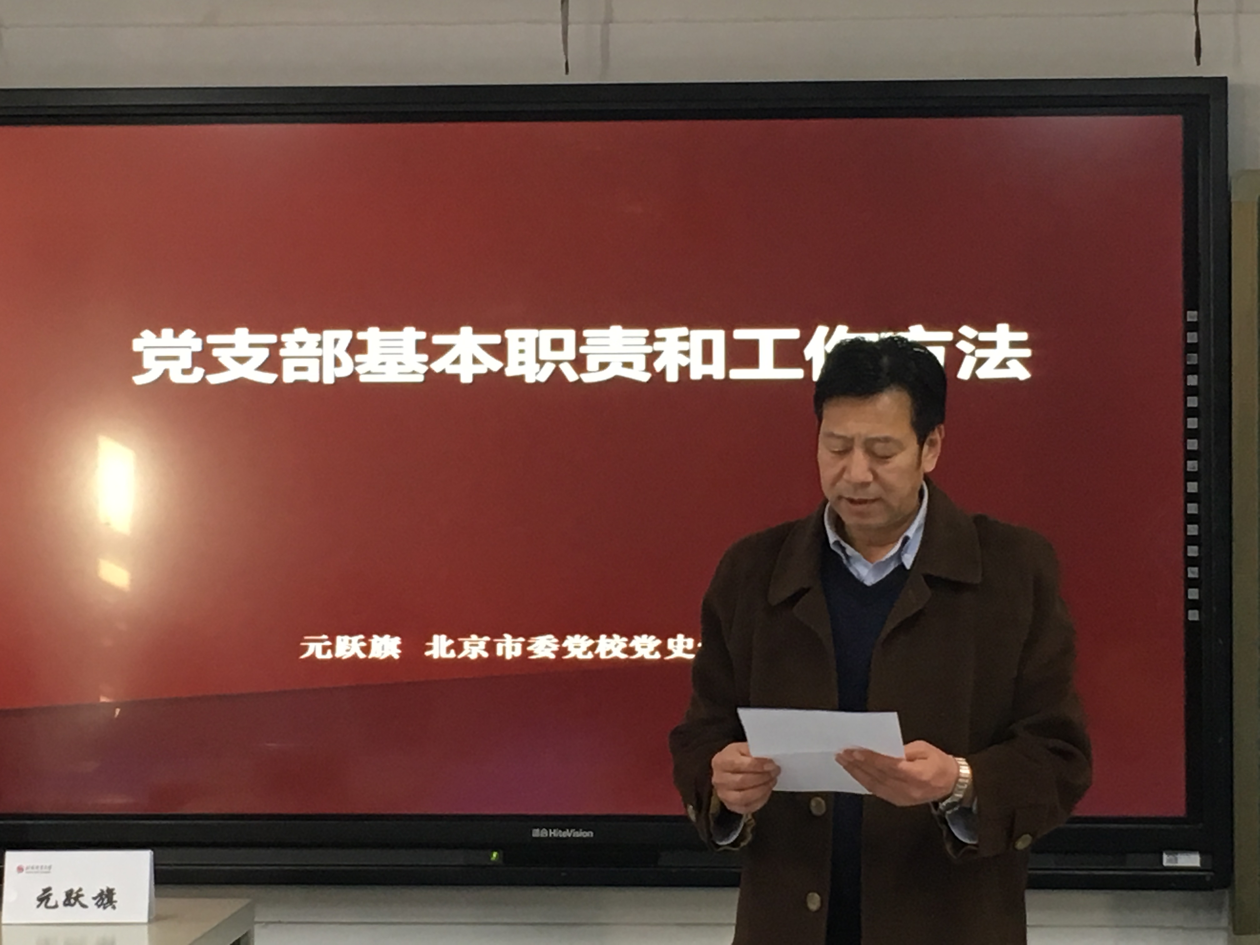 2017年11月24日,机关党委在教学楼305教室举办党支部委员会成员党建工作培训,邀请北京市委党校元跃旗教授担任讲师,为21个党支部委员会成员做了题为《党支部基本职责和工作方法》讲座。