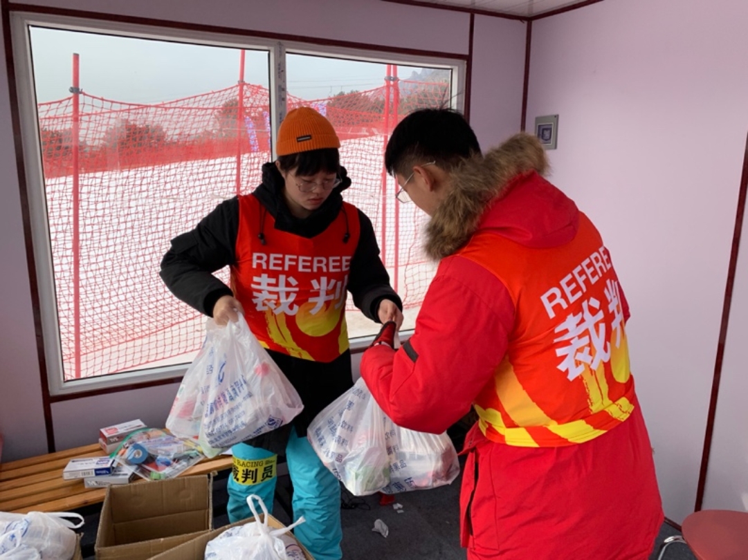作为北京市第一届冬季运动会,社会各界给予极大的关注度,对裁判员也有极高的要求。天将破晓,战队队员已到达雪场,等待运动员进场。由于本次比赛具有参赛人数多、参赛运动员年龄小、工作人员少等特点,每名滑雪战队队员都身兼数职,多岗位工作。由于比赛是不间断进行,队员们的午餐只能在雪道旁简单吃些面包、能量棒等方便食物。夜幕降临,队员们也没有收工,为第二天的比赛更换旗门、检查线路、平整雪道以及准备第二天比赛所需物资。