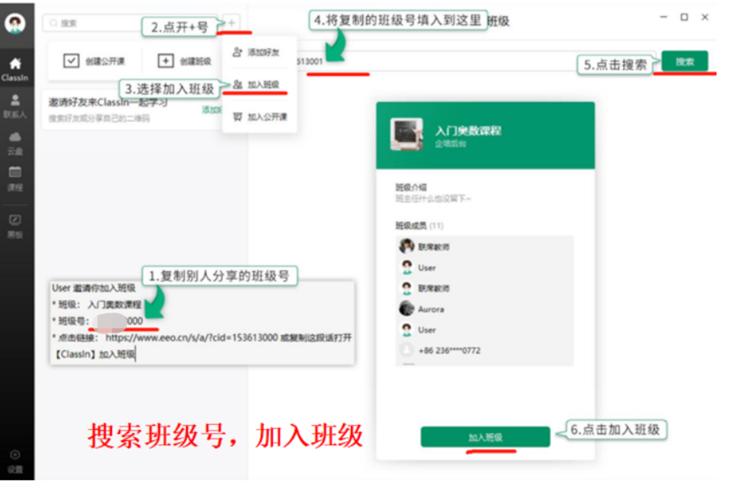 5、往届生跟班补课学习方法。请通过ClassIn手机APP,按课表信息,搜索“班级码”加入班级进行学习。