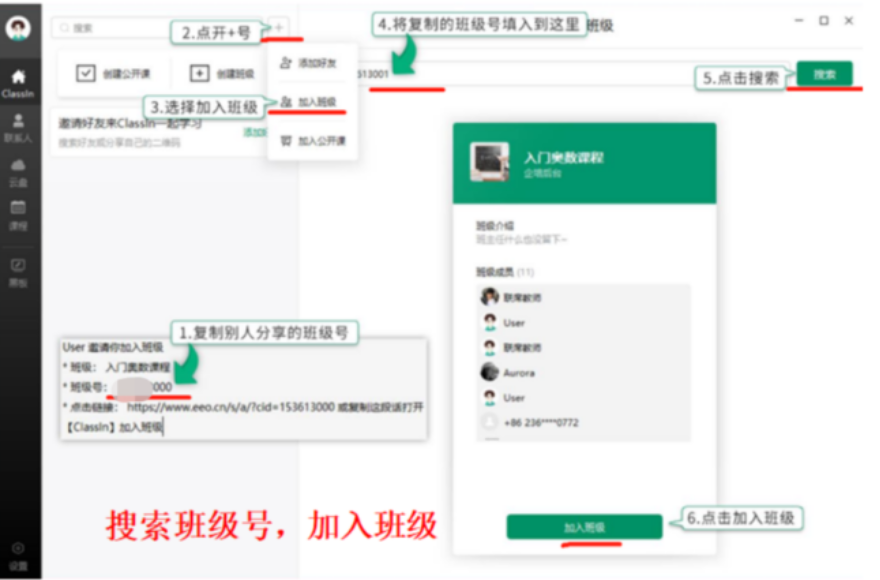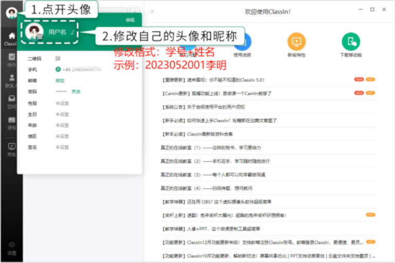 3、各年级学生根据课表安排,提前十分钟进入ClassIn课堂对应班级学习(提醒:如因本人电话号码变更,未收到ClassIn平台课程短信通知,可按课表信息,搜索“班级码”加入班级进行学习。(登录后必须修改自己的用户名为“学号姓名”例“2201110001李明”)。