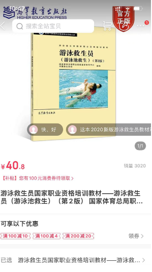 3、教材,请于上课前自行在高教社微书店购买游泳救生员(游泳池救生)第2版,见下图。