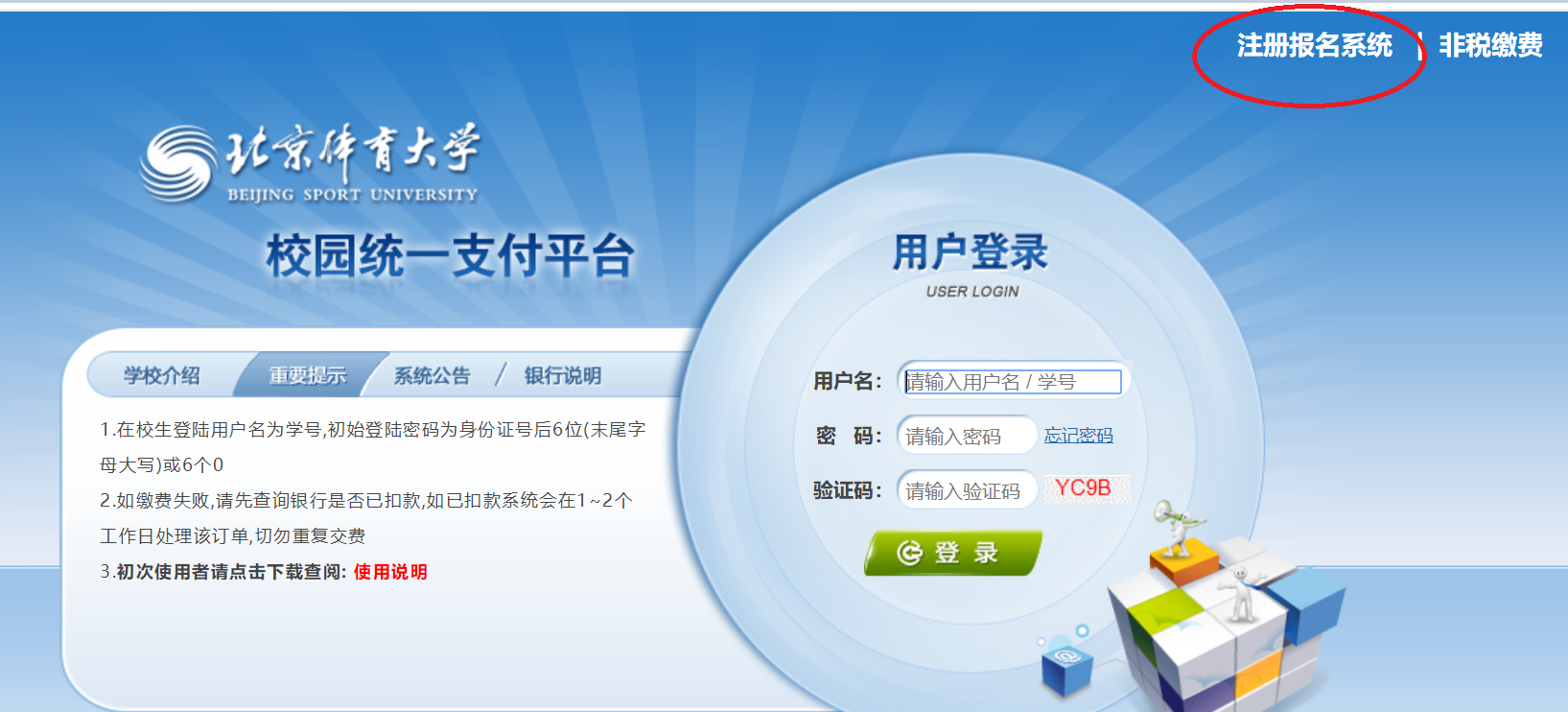 一、使用电脑登录英博体育校园统一支付平台,http://cwcwx./xysf/,点击右上角“注册报名系统”,(由于安全设置,推介使用360、火狐、chrome等常用浏览器)。