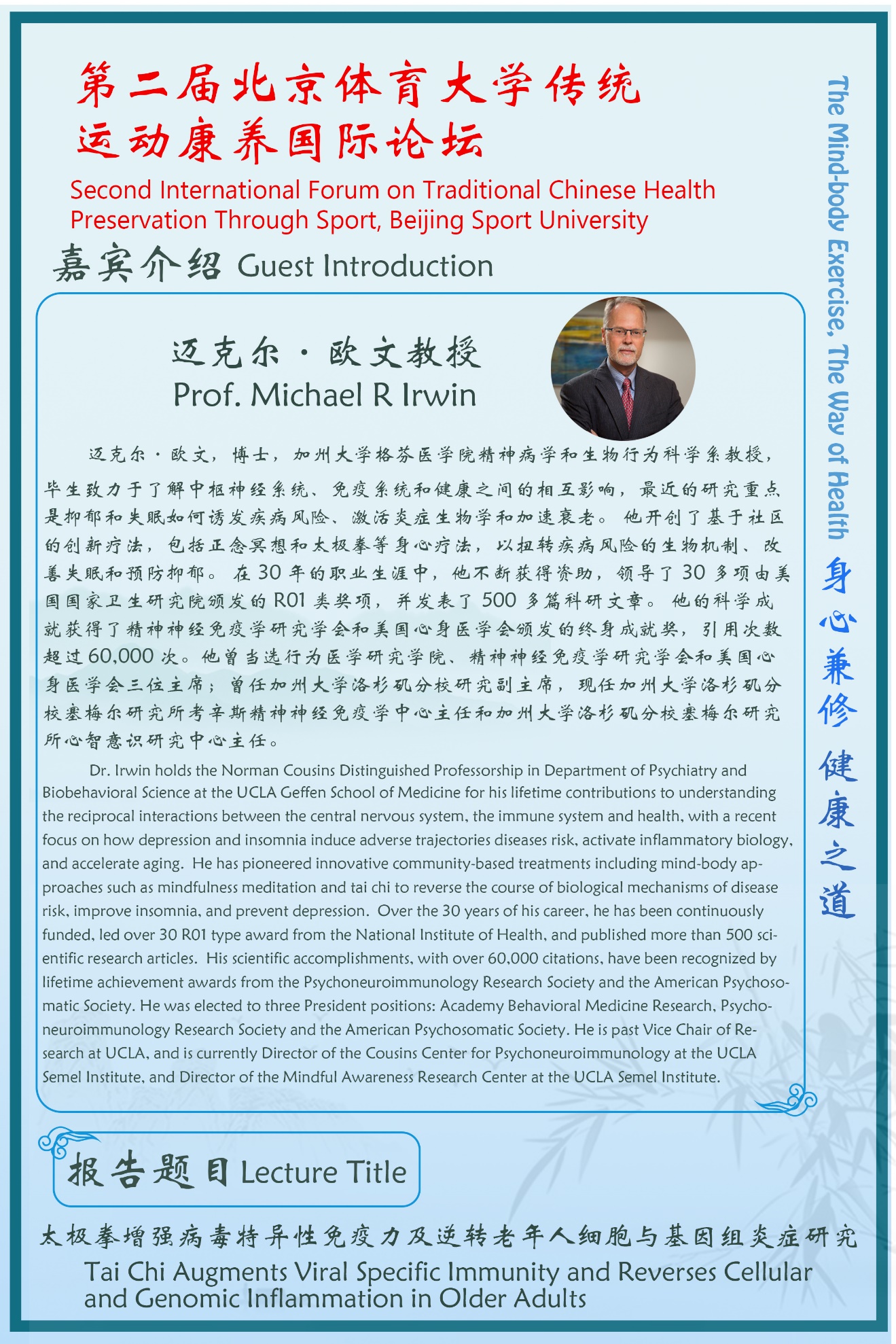Traditional Chinese Health Preservation Culture, which combines the health promotion and disease prevention, is the valuable treasure that benefits human health with several thousand years of history. Beijing Sport University wishes to facilitate domestic and international academic communication and scientific research cooperation in traditional Chinese sports health promotion and disease treatment and prevention, to explore the research field of traditional Chinese exercise health promotion, and to contribute to human's health with the theme of "Promoting the Communication of Health Preservation Through Traditional Chinese Sport at Home and Abroad, Guiding the Development of Traditional Chinese Health Preservation Research"