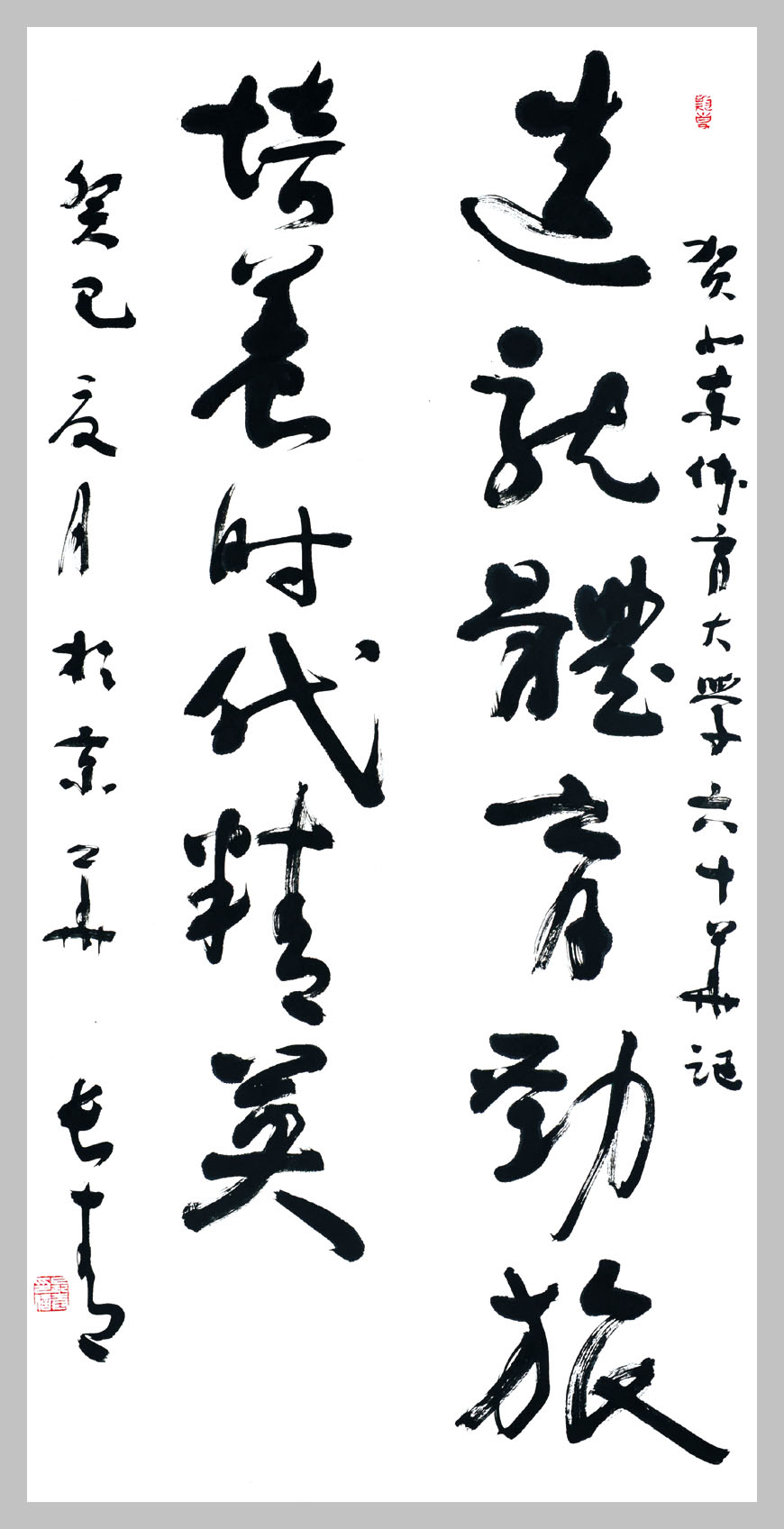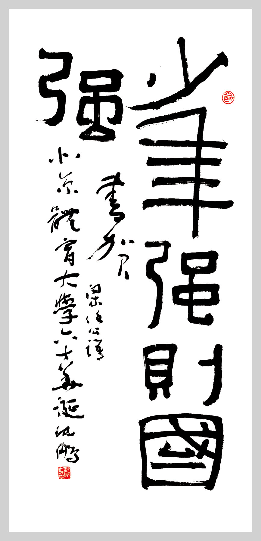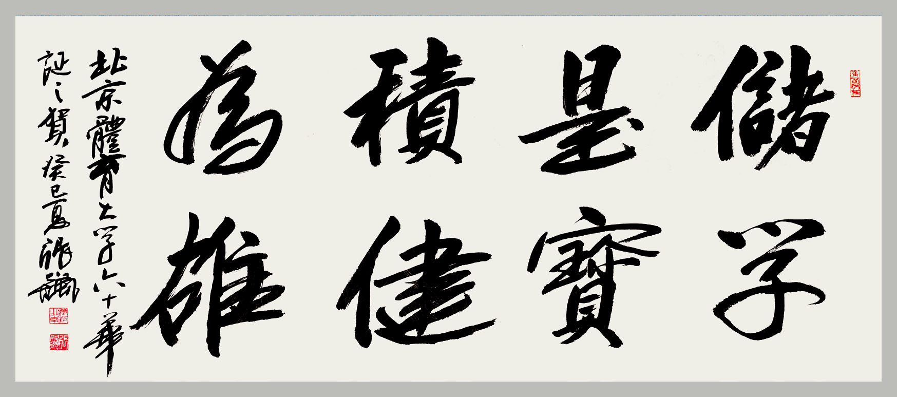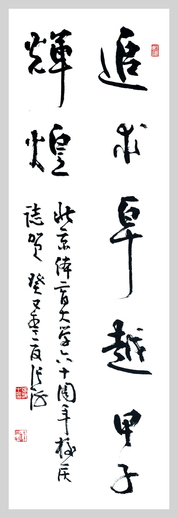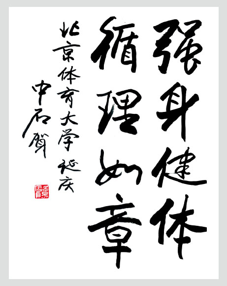 | 强身健体,循理如章 作者:欧阳中石,中国人民政治协商委员会委员,中国书法家协会顾问 | 少年强则国强 作者:沈鹏,中国书法家协会名誉主席 | 追求卓越,甲子辉煌 作者:张海,中国书法家协会主席,五环书画摄影协会顾问 |