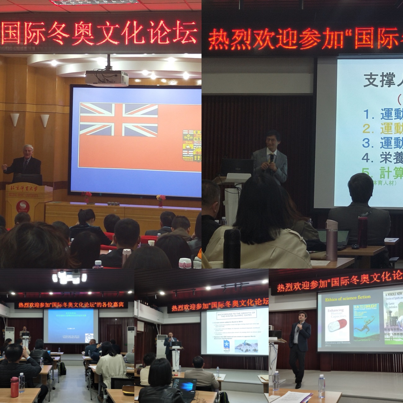 加拿大西安大略大学的Robert K. Barney教授是体育史和奥林匹克研究的著名学者,是皮埃尔德顾拜旦终身研究成就奖的获得者,他阐释了枫叶作为加拿大标志出现在奥运会赛场上的历程;日本爱知省立大学教育福祉学院副院长汤海鹏教授,他结合人工智能促进日本冰雪运动竞技运动的实践,作了题为《体育人工智能——冬奥会冰雪项目的挑战》的精彩报告;澳大利亚墨尔本维多利亚大学的Richard Baka教授是维多利亚大学奥林匹克研究网络的联合创始人,维多利亚大学体育与健康研究所副所长,解读了《奥林匹克2020议程》相关问题,论述了冬奥会项目设置的发展历程;台湾国际奥林匹克和多元文化研究的创始人、台湾体育大学许立宏教授介绍了冰雪运动在无雪的台湾地区进行推广的困境与契机;美国宾夕法尼亚大学教授Francisco Javier Lopez Frías博士介绍了几种最新开发的有助于增强体育表现,却有可能对奥林匹克运动要素产生不利影响的科技产品。他的报告特别关注以下三个道德议题:“体育的内在本质”、“运动带来的身体伤害和风险”、“体育在社会中的作用”。