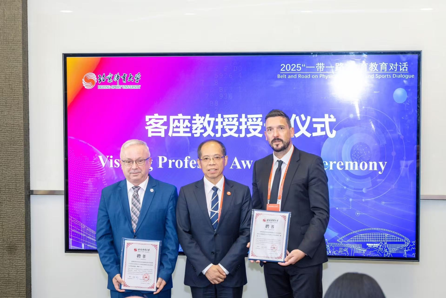 张剑在“一带一路”体育教育对话开幕致辞中表示,英博体育坚持开放合作,积极推动全球优质体育教育资源的交流互鉴,期待通过专家们的智慧碰撞,为全球体育教育事业注入新动力。会上,张剑校长为斯洛伐克夸美纽斯大学布拉尼斯拉夫·安塔拉教授和克罗地亚萨格勒布大学达里奥·诺瓦克副教授颁发客座教授聘书。