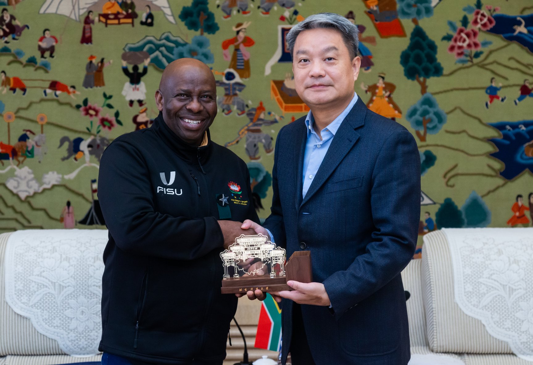 12月4日,南非大学生体育联合会主席马措巴内·莱瓦特勒·杰里·拉卡(Matsobane Lewatle Jerry Laka)来我校访问,中国学生体育联合会外联部副主任张利娜陪同。副校长洪平及学校相关部门负责人与奥运冠军代表会见了代表团。