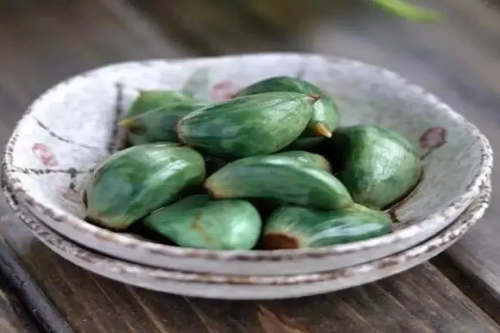 开水煮熟,外用染红桃仁、杏仁、