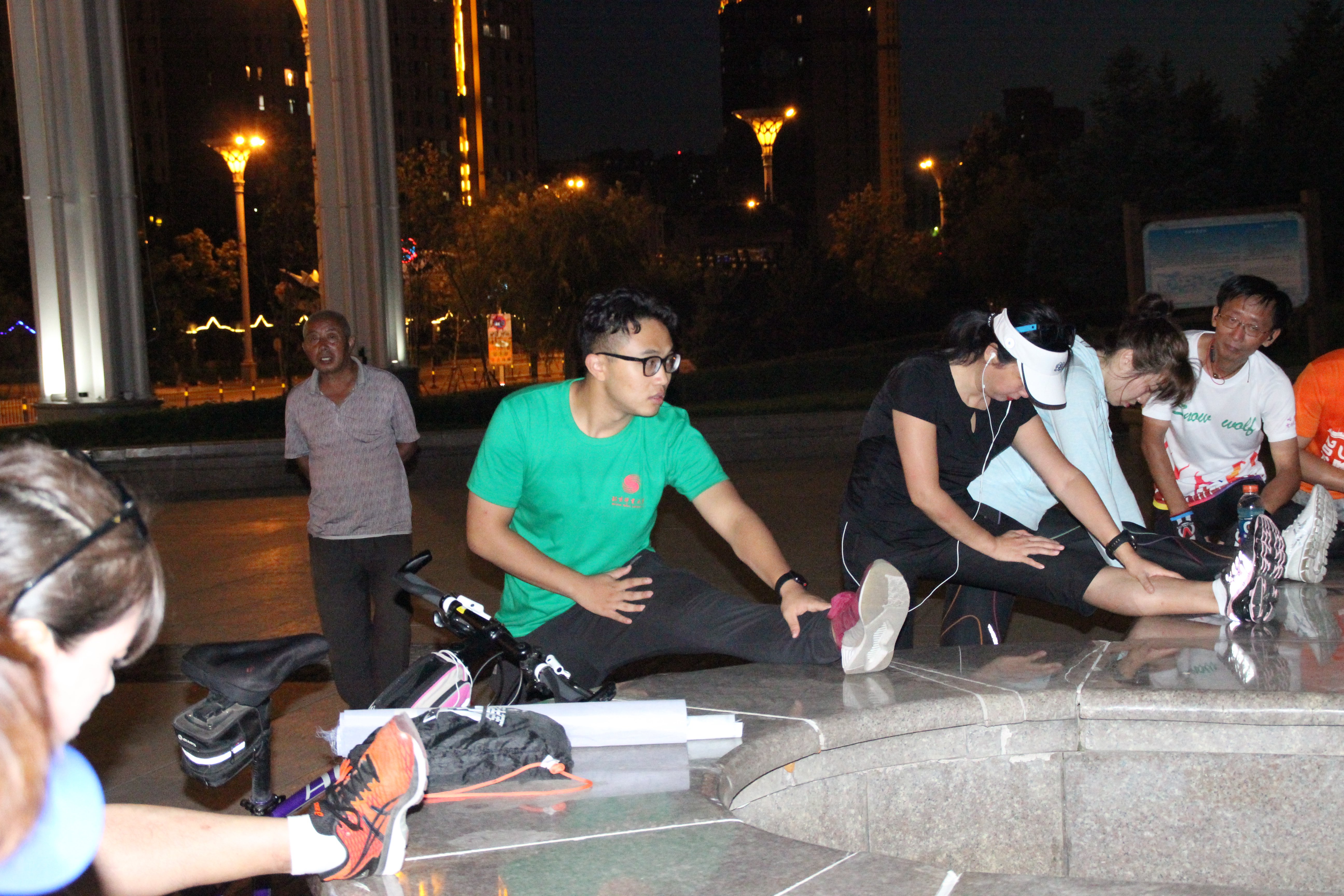 同学们首先带领着俱乐部成员们进行了充分的热身活动,并且教给了大众们一些简单易学的热身动作,让大家在跑步之前能够做好充足的准备,预防受伤。晚7:30,跑团成员们陆续回到集合地点,在实践团成员们的指导下进行放松和牵拉。放松结束后,同学们向跑团成员们分发宣传单,介绍了几种实用的放松方法,供大家参考使用。跑团成员们针对自己在运动过程中产生的损伤与疼痛向同学们进行咨询,同学们都耐心地进行解答。既为跑团成员解决实际问题,又锻炼了自己的能力。